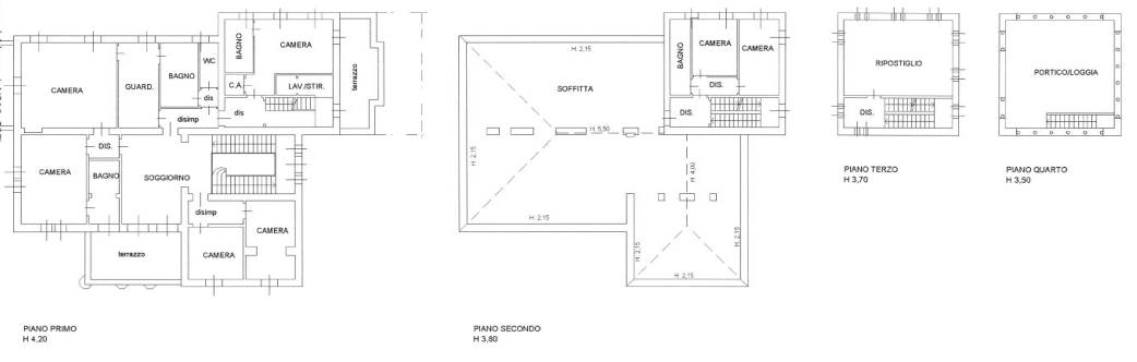 al piano secondo; ripostiglio e vano scala al piano terzo; portico/loggia e vano scala al piano quarto; 4 ripostigli, 3 cantine, 2