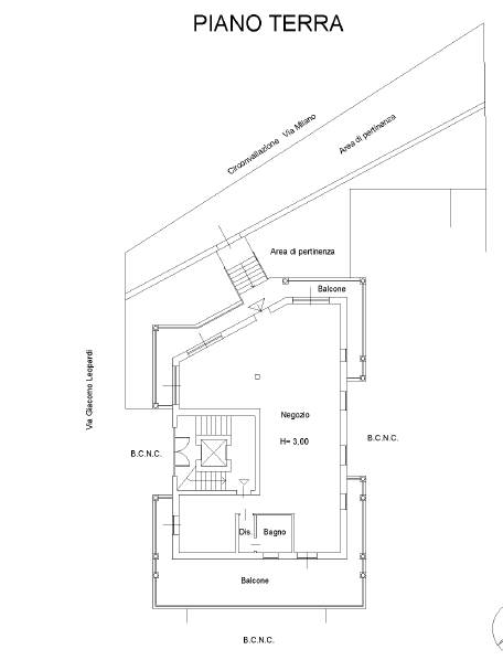 negozio allo stato rustico, in trezzano sul naviglio (mi), via leopardi n. 1, al piano terra composto da scala di accesso, balcone al piano, ampio locale negozio, disimpegno, bagno, altro ampio balcone al piano e tre aree esterne pertinenziali, di cui una oggetto di fascia di rispetto stradale e comunale, della superficie commerciale di 174 mq