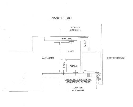 appartamento al p.1° della superficie commerciale di 91 mq, composto ingresso, soggiorno, servizio igienico, cucina, disimpegno, n. 2 camere, ballatoio di proprietà gravato da servitù di passo con box al p.t.