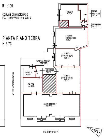 Compendio Immobiliare Unico composto da locale commerciale (negozio) posto al piano terra di un edificio suddiviso in unità abitative e locali accessori, composto da un locale principale, tre vani adibiti a saletta, antibagno e bagno dimensionati per disabili, vano cucina e preparazione, bagno per il personale e locale ad uso deposito; il negozio ha accesso diretto dalla via Umberto I° al civico 117 e altro accesso dall’ingresso comune del fabbricato.