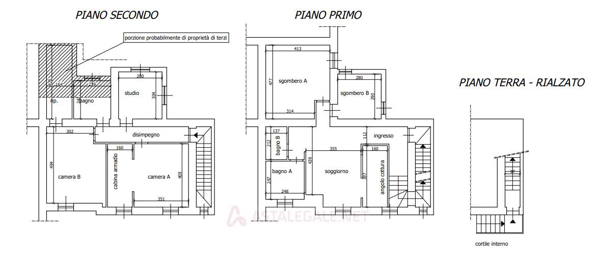 - piano secondo: disimpegno, camera con cabina armadio, camera, studio, bagno e ripostiglio.