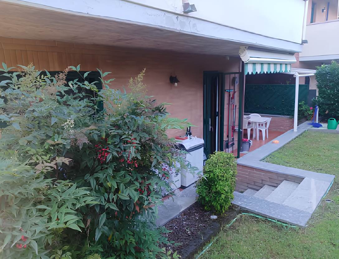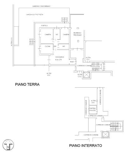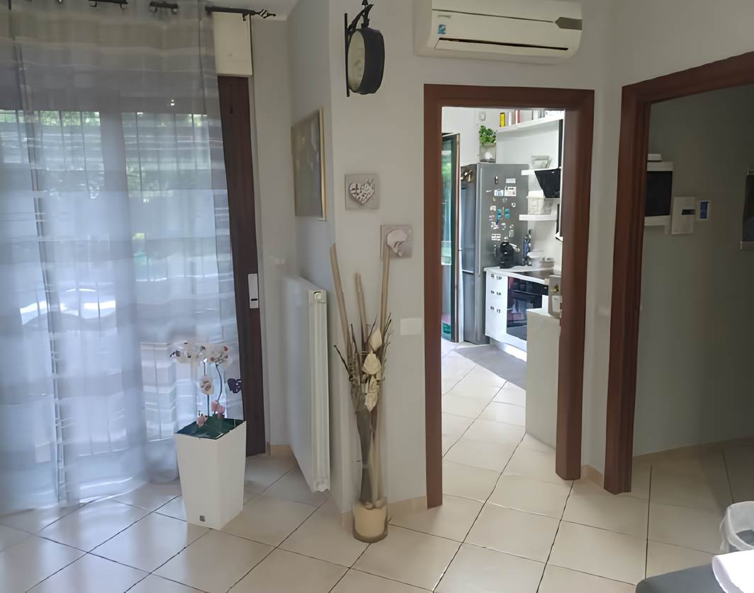 appartamento posto al piano terra composto da tre locali, cucina abitabile, doppi servizi, portico e giardino di proprietà; con annessi cantina al piano interrato e box di autorimessa al piano interrato. Dotato di riscaldamento termoautonomo, aria condizionata, inferriate