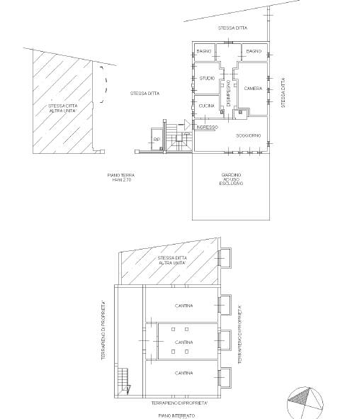 intera piena proprietà di cascinali ad uso abitazione al piano terra composto da soggiorno, cucina, studio, bagno, ripostiglio, a destra camera, bagno, con giardino ad uso esclusivo, al piano interrato n. 3 locali cantina, oltre a terreni agricoli.