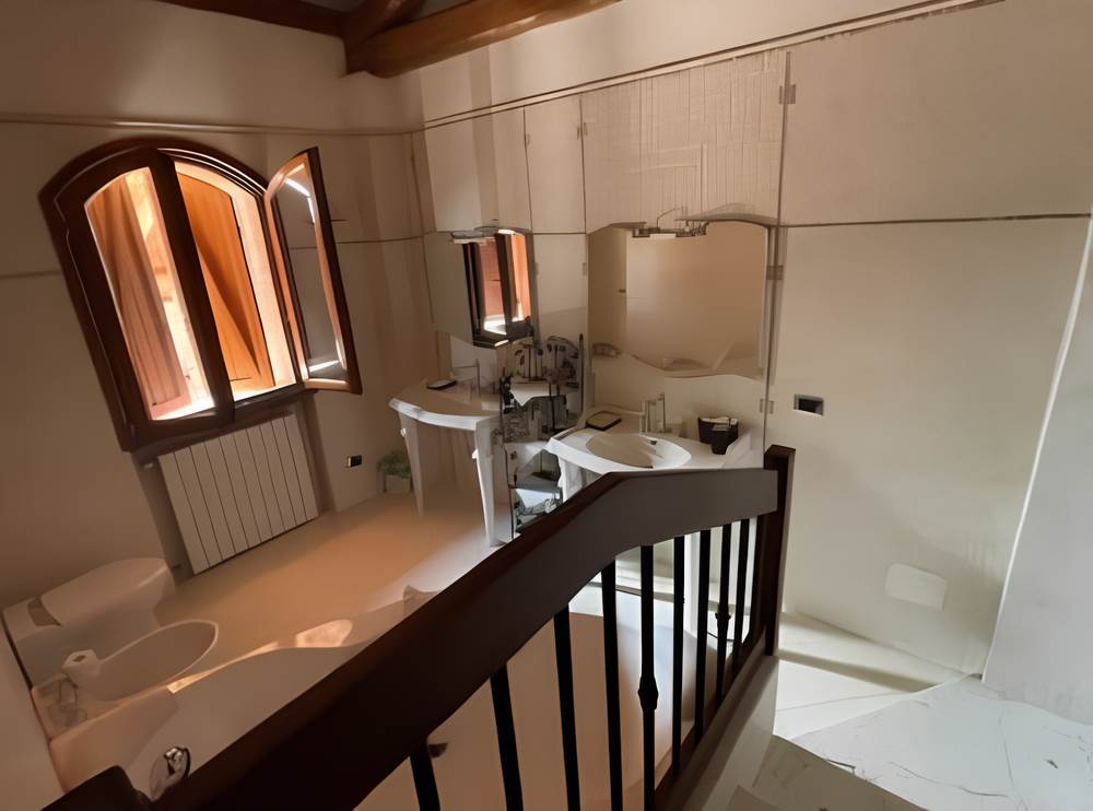 al primo piano: disimpegno dotato di portafinestra esposta a sud verso balcone affacciato su cortile e area verde privata e di finestra esposta a nord. camera matrimoniale su due livelli dotata di finestra e portafinestra