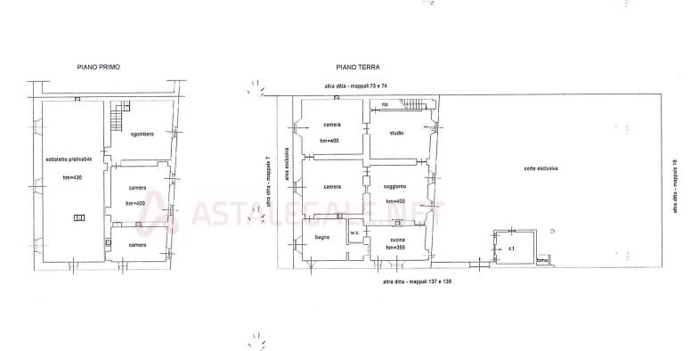 dimora storica su due piani fuori terra con giardino pertinenziale e rustico in corpo staccato, con accessi principali da via guglielmo marconi n.18 e da via maestra 47. si precisa che il seminterrato, particella autonoma con accesso indipendente, non è compreso nel presente lotto ma nel lotto 1. il piano terra è distribuito con soggiorno, cucina, bagno di servizio, studio, due camere con accesso a piccola area esterna esclusiva, bagno padronale e ripostiglio sottoscala; tramite scala interna si accede al piano primo composto da locale di sgombero, due camere e vano sottotetto praticabile. la villa dispone di cortile pertinenziale esclusivo, lato ovest, con entrostante, in corpo staccato, rustico destinato a centrale termica e porticato