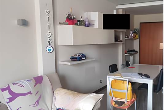 Appartamento posto al piano primo composto da un locale oltre servizi con annesso vano cantina al piano cantinato e box della superficie commerciale di 62,00 mq di piena proprietà.