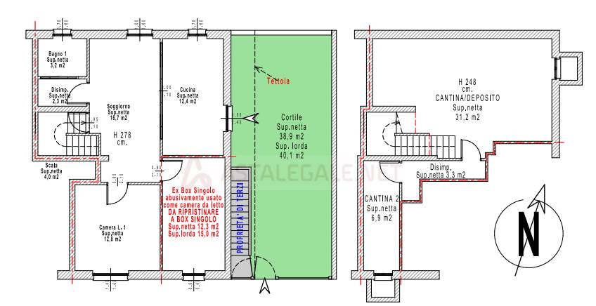Appartamento bilocale della superficie commerciale di mq. 88, composto da cucina, camera, bagno, vano scale per accedere ai tre vani cantinati destinati a deposito senza permanenza di persone. Cantina. Box singolo.