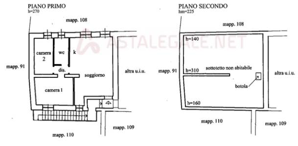 appartamento al piano primo composto da ampio locale ingresso/soggiorno con angolo cottura, disimpegno, bagno e due camere, oltre sottotetto, non abitabile, collegato tramite botola situata nel locale ingresso.